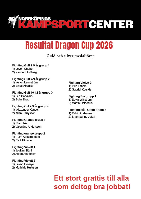 Här kommer resultaten på guld och silver medaljörerna på Dragon Cup. Igår genomfördes Dragon Cup en intern tävling i fighting för barn . Ett 40-tal barn deltog och alla vann en medalj men inte bara en medalj utan en erfarenhet rikare. Ett stort tack till alla som hjälpte till och gjorde detta möjligt resultatlista kommer snart. Tack alla barn som deltog bra kämpat.